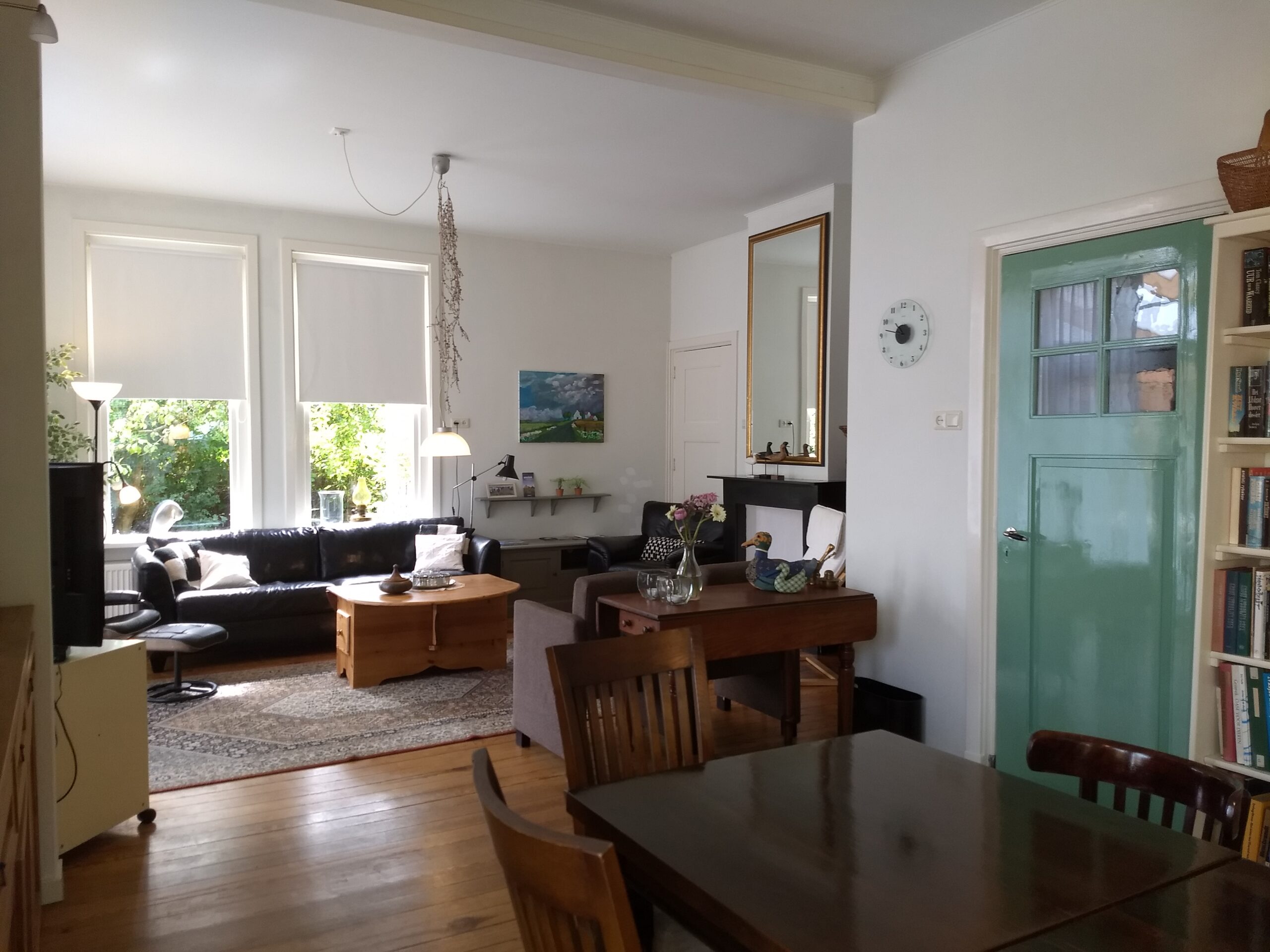 Authentiek ingerichte huiskamer met grote eettafel en zithoek
